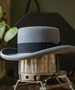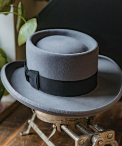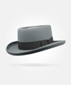 Classic Charm Pork Pie Fur Felt Hat in Grey, a timeless accessory that combines elegance and style. Crafted from premium fur felt, this hat features a distinctive flat crown and a narrow brim, providing a sophisticated yet casual look.