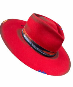 “Distressed Fedora with Red Multi-color Patchwork Design” is hand-distressed, hand-dyed, and hand-torched, ensuring no two share the same color or design. Each piece is uniquely imperfect, with subtle variations from product images.