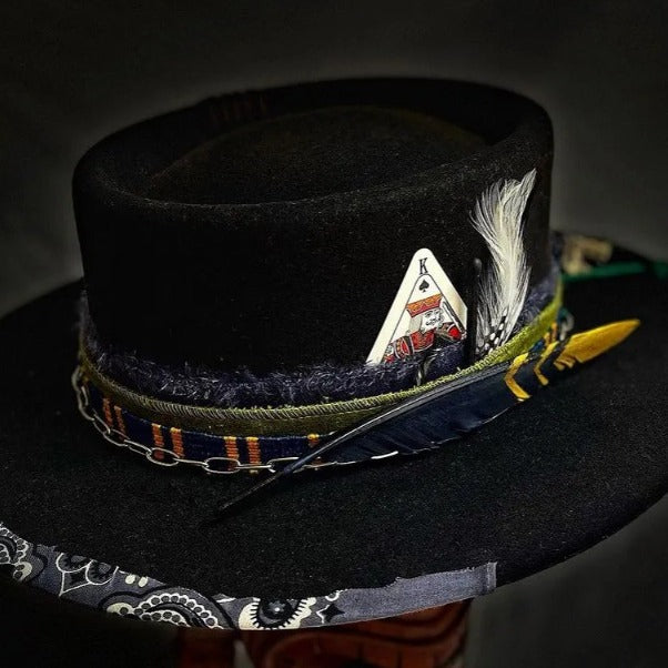 “Distressed Fedora with Rounded Crown and Colorful Ribbon Adornments” is hand-distressed, hand-dyed, and hand-torched, ensuring no two share the same color or design. Each piece is uniquely imperfect, with subtle variations from product images.