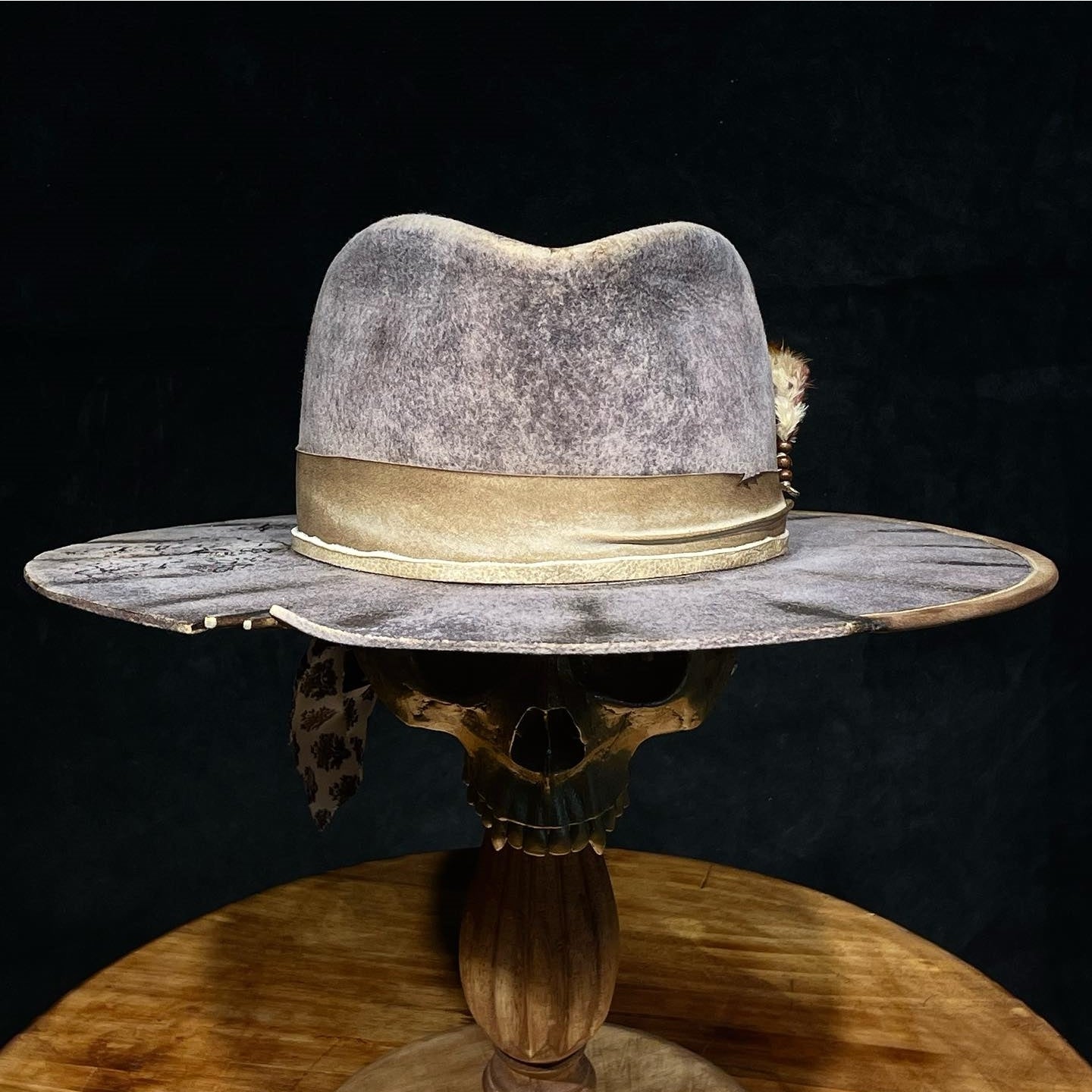 “Ebony Blue Vintage Felt Cowboy Hat” is hand-distressed, hand-dyed, and hand-torched, ensuring no two share the same color or design. Each piece is uniquely imperfect, with subtle variations from product images.