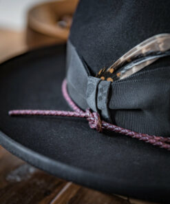 Modern Felt Hat, This is a medium height centre dent with 7 cm / 2.75 in overwelt pencil roll brim. It features 38 mm modern grosgrain hatband with a double back bow & leather cord.