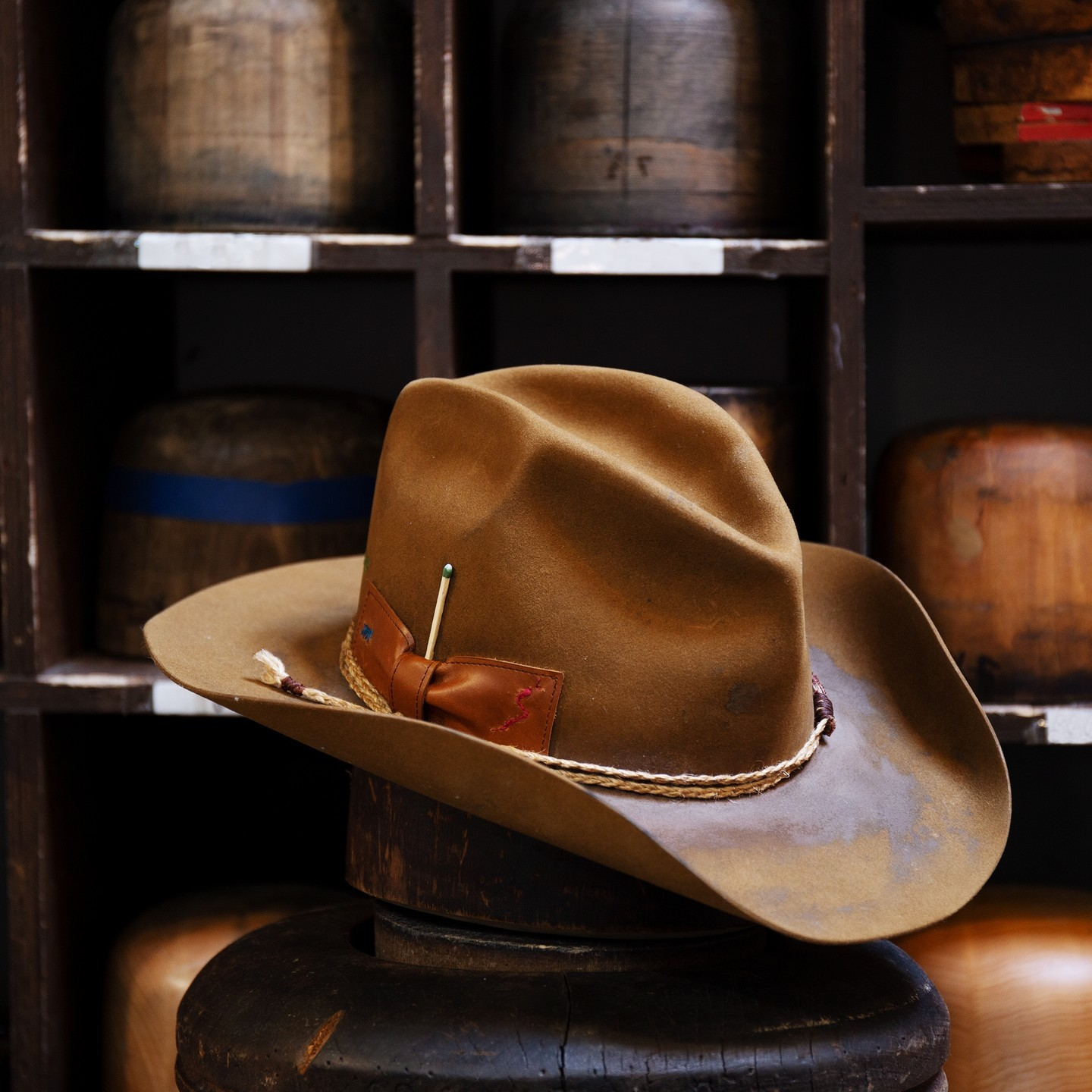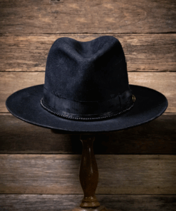 “Night Sky custom burned flat brim wool felt cowboy hat” is hand-distressed, hand-dyed, and hand-torched, ensuring no two share the same color or design. Each piece is uniquely imperfect, with subtle variations from product images.