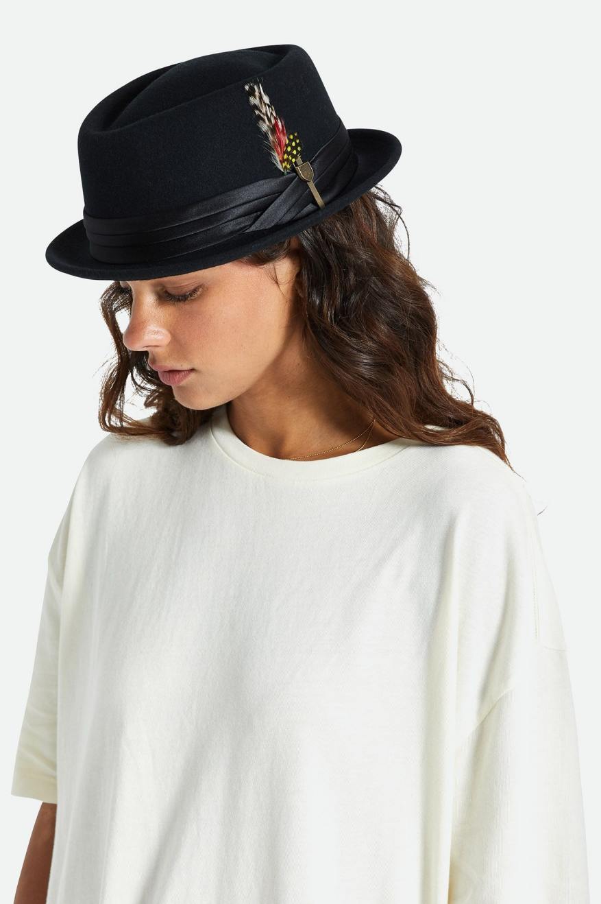The Stout Pork Pie is a classic style hat. With a satin band, metal crest pin, and a custom line, this one isn’t short on details. Its feather completes the look and will elevate any outfit.