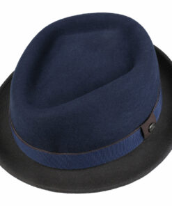 This pork pie hat combines two strong colours in a trendy two-tone look. The brim contrasts starkly with the crown, while the double layer of grosgrain ribbon trim picks up on the colour scheme. With its turned-up brim, diamond-shaped crown and typically jaunty finish, this hat rounds off casual outfits and looks just as good strolling around town as it does when visiting your favourite club.
